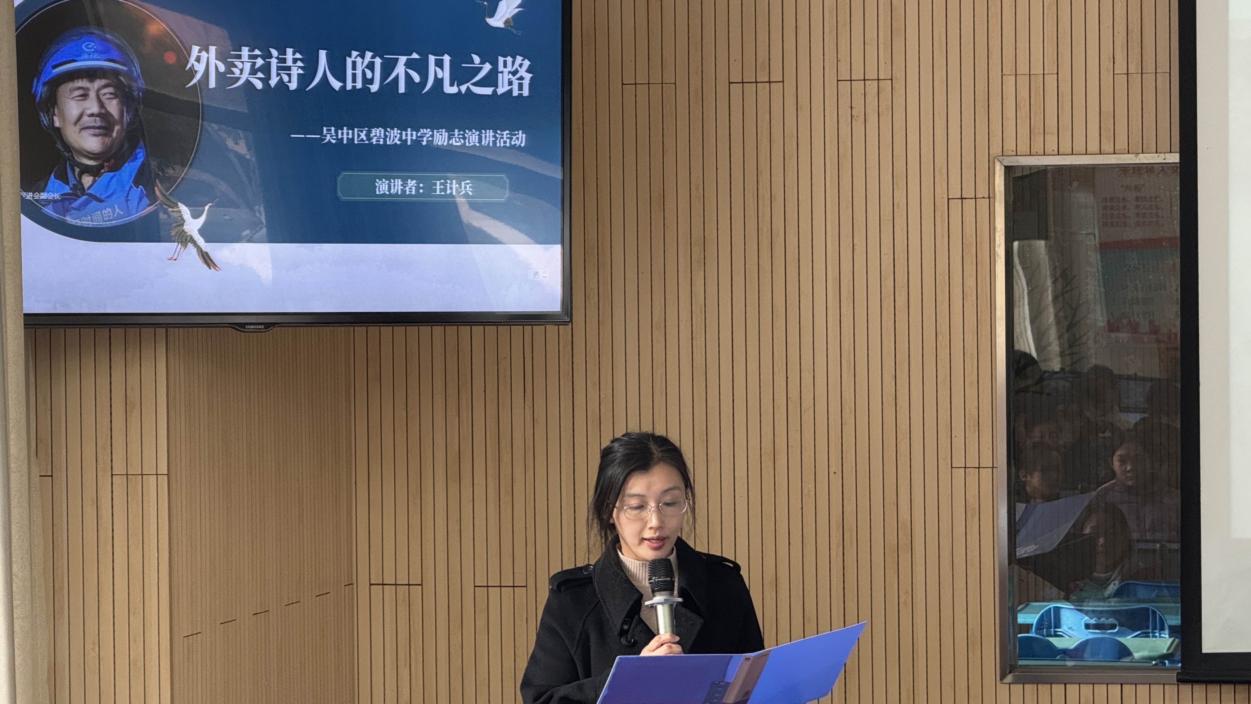 活动伊始,主持人吴琴老师以温暖而富有感染力的话语拉开序幕。她向在场师生隆重介绍了王计兵——这位从平凡生活里走来的诗人,在成长的风雨里跋涉,在文学的瀚海中求索,用最朴素的文字,将人生旅途的点滴感悟,酿成了触动人心的诗篇。吴老师的讲述,让同学们对这位“以笔为犁的追光者”充满了好奇与敬意,也为整场活动奠定了励志向上的基调。