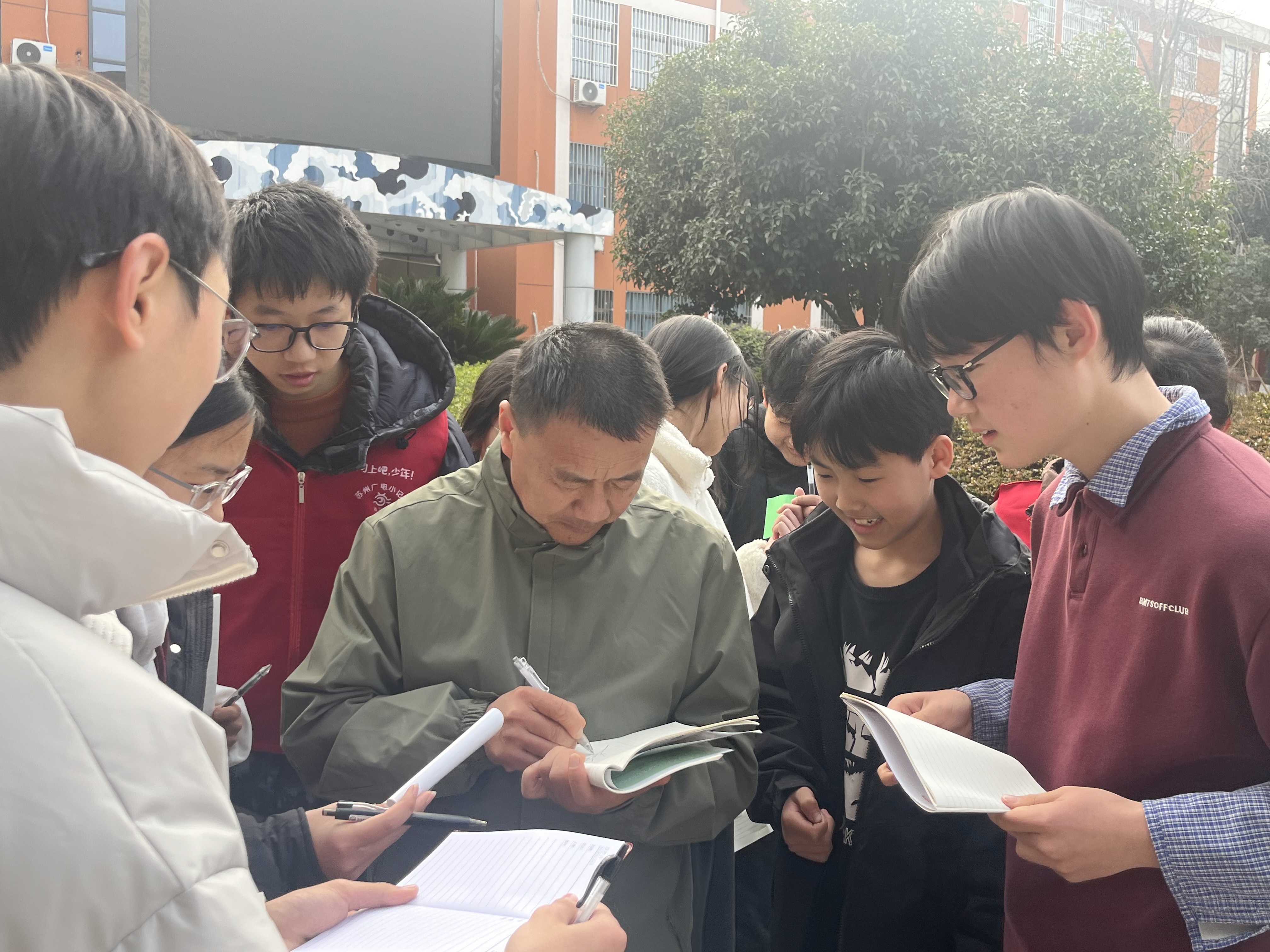 一句句真诚的对话,一次次热烈的掌声,让这场演讲超越了“听故事”的范畴,成为一堂生动的“活教育”实践课。碧波中学一直秉持“活教育”的办学理念,主张教育要贴近生活、贴近实际,让学生在真实的体验中感悟成长。此次邀请诗人进校园,正是“活教育”理念的生动体现——它打破了课堂与生活的壁垒,让学生看到了文字与成长的紧密联结;它告诉孩子们,文学从不是遥不可及的空中楼阁,而是扎根生活的精神沃土;它更让“热爱”与“坚持”这两个词,变得具体而可感。