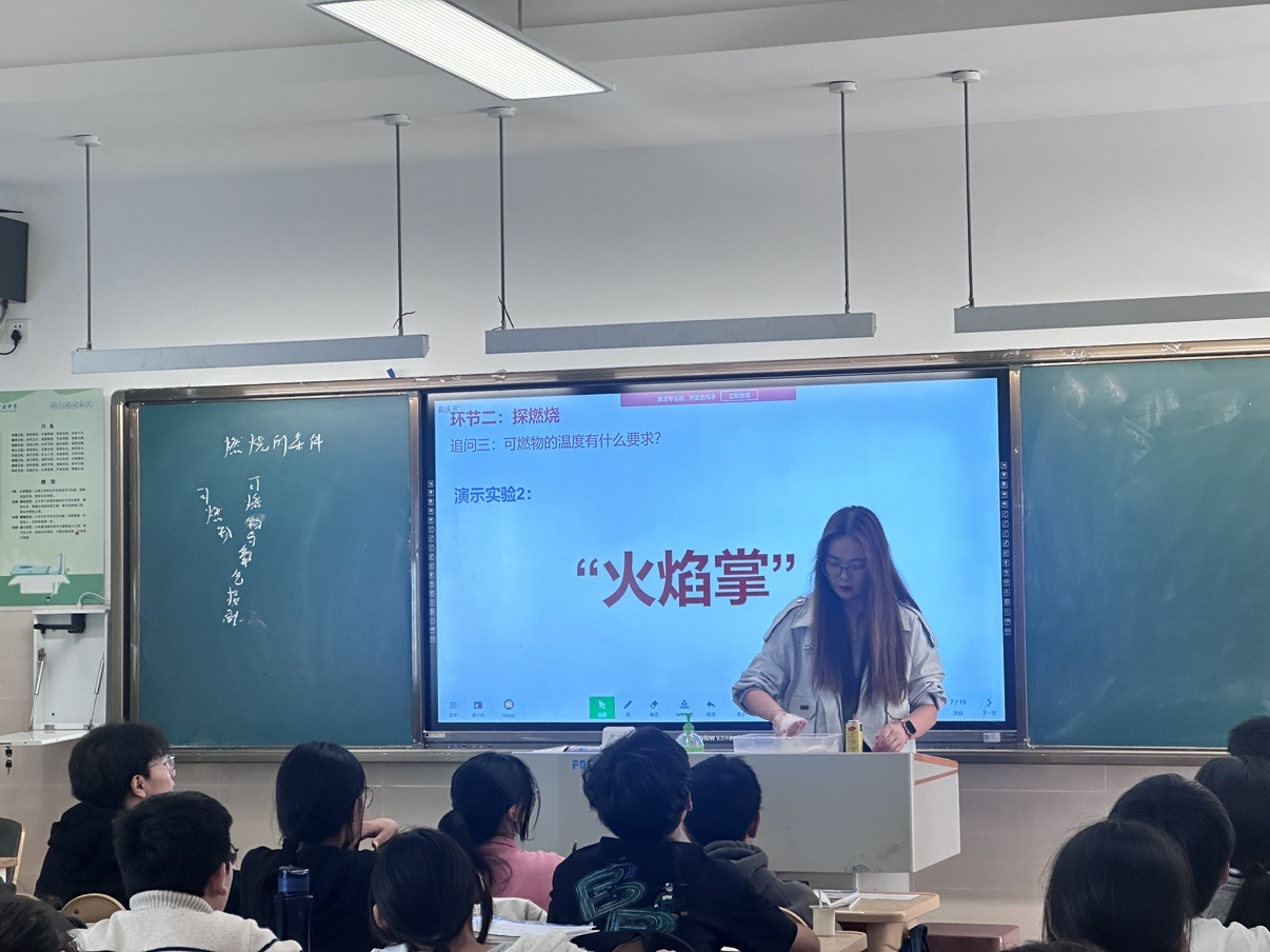 化学组王银萍老师执教《燃烧与灭火》,以“火焰掌”等震撼实验制造认知冲突,引导学生从生活经验和实验现象中自主探究燃烧的条件与灭火原理。