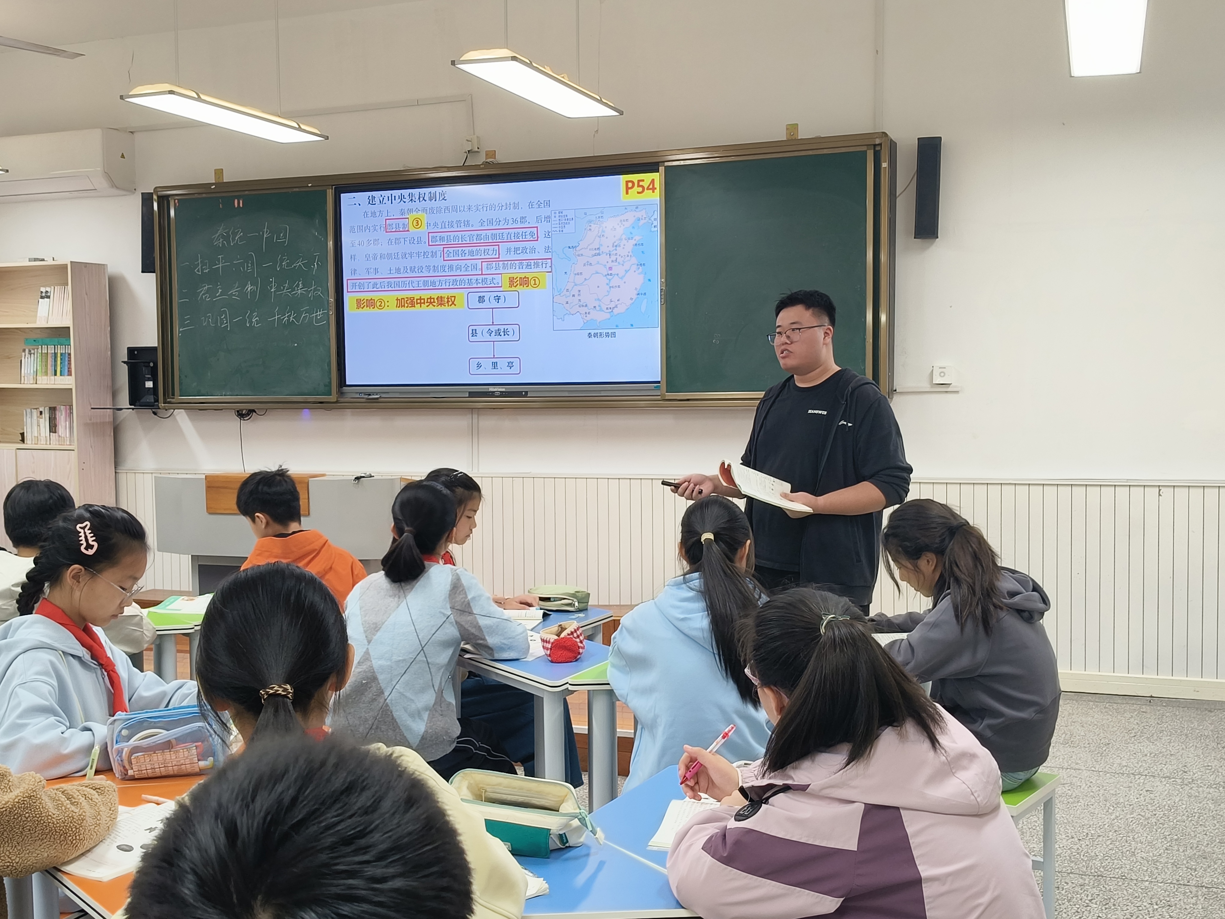 历史组左俊杰老师执教《秦统一中国》,围绕“统一”主题,通过情景剧表演、地图分析等方式,生动呈现秦朝制度与措施。