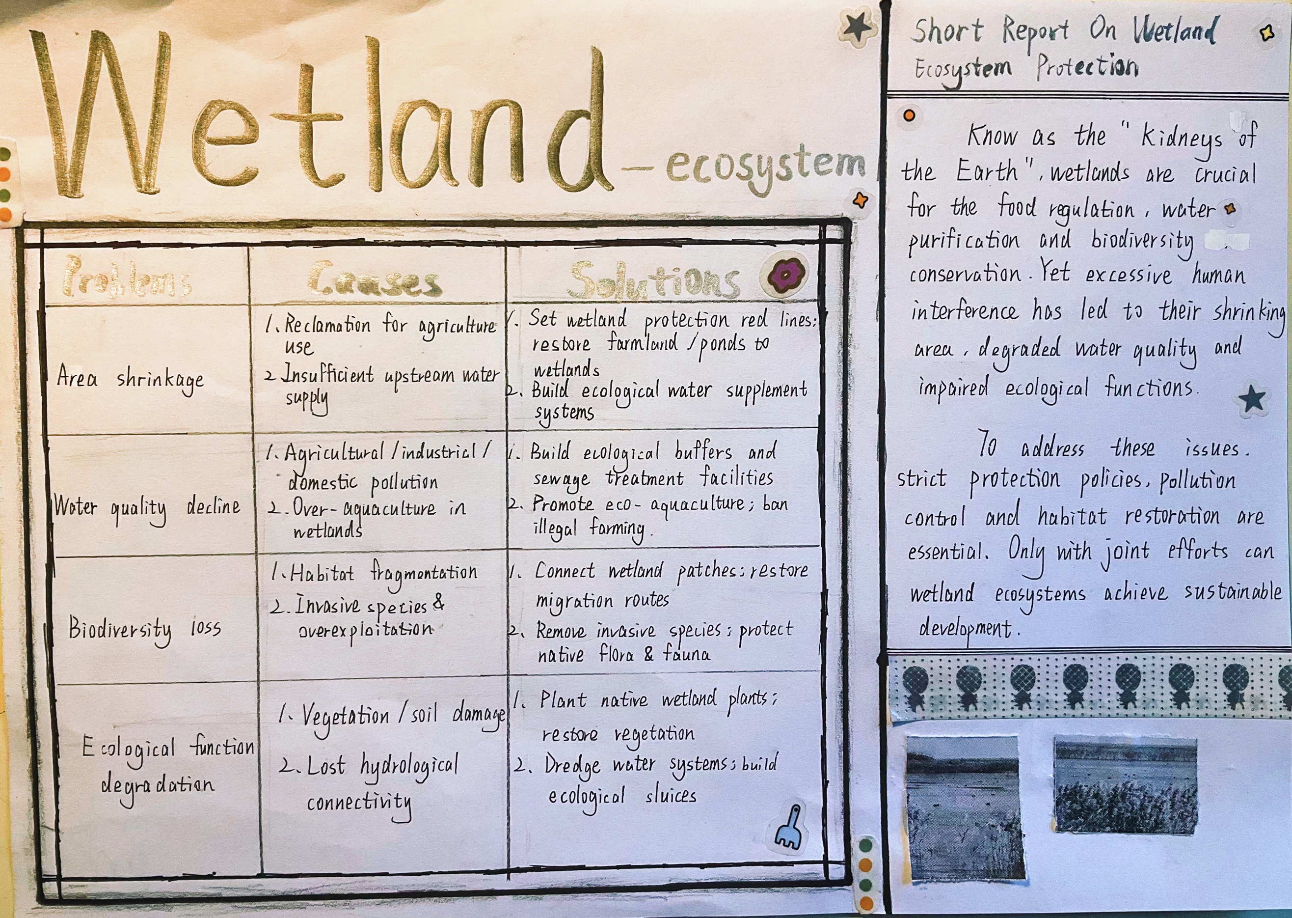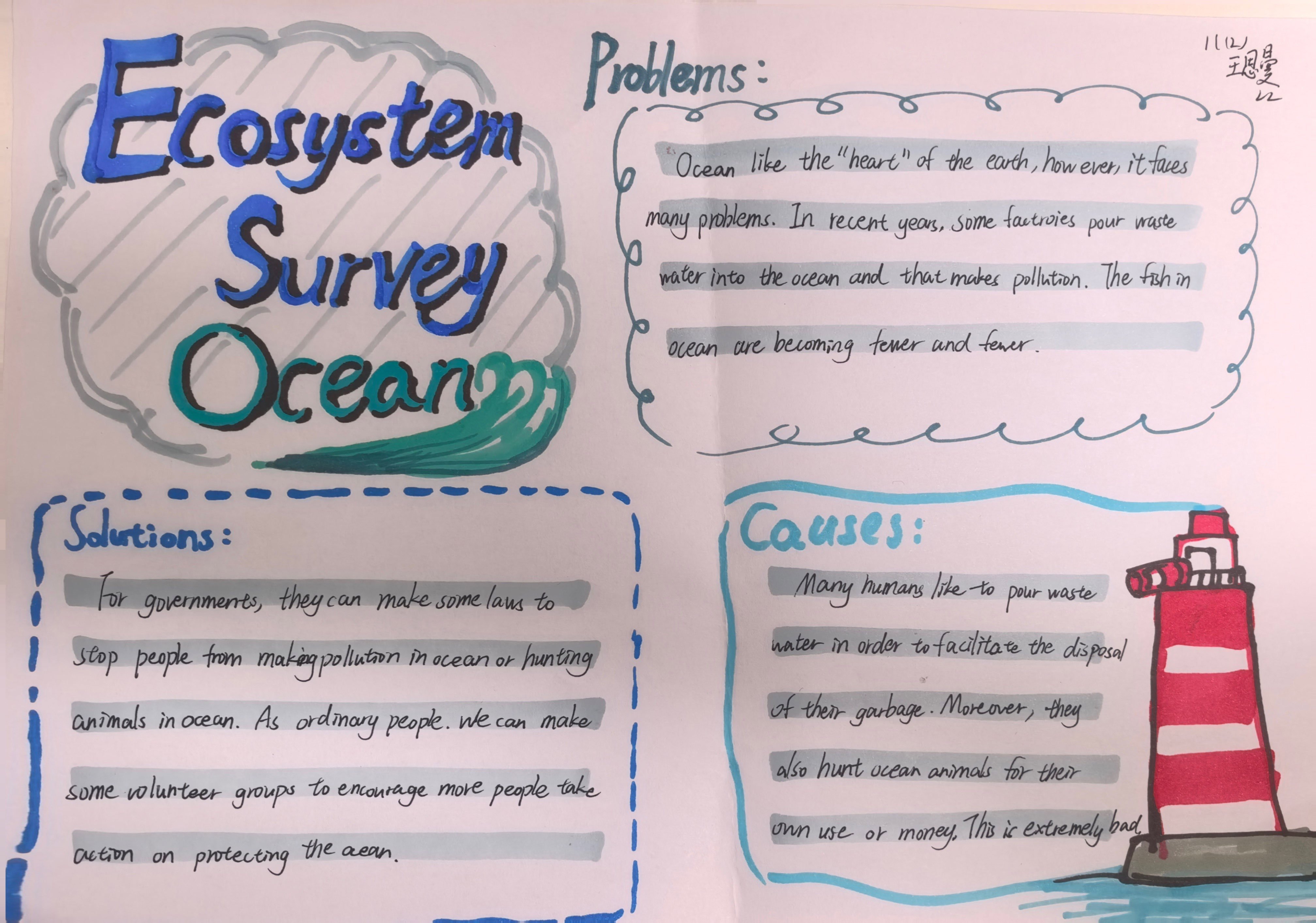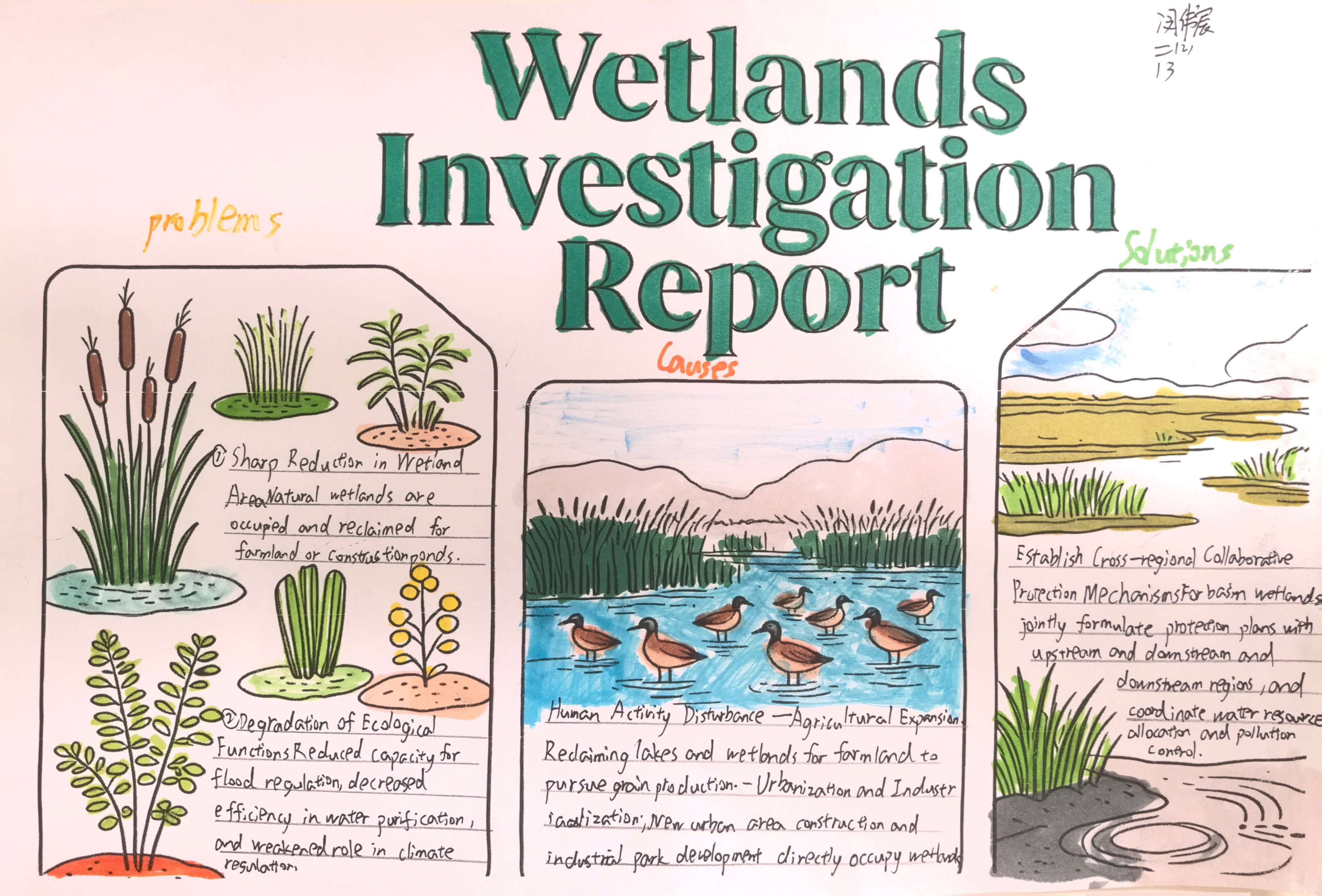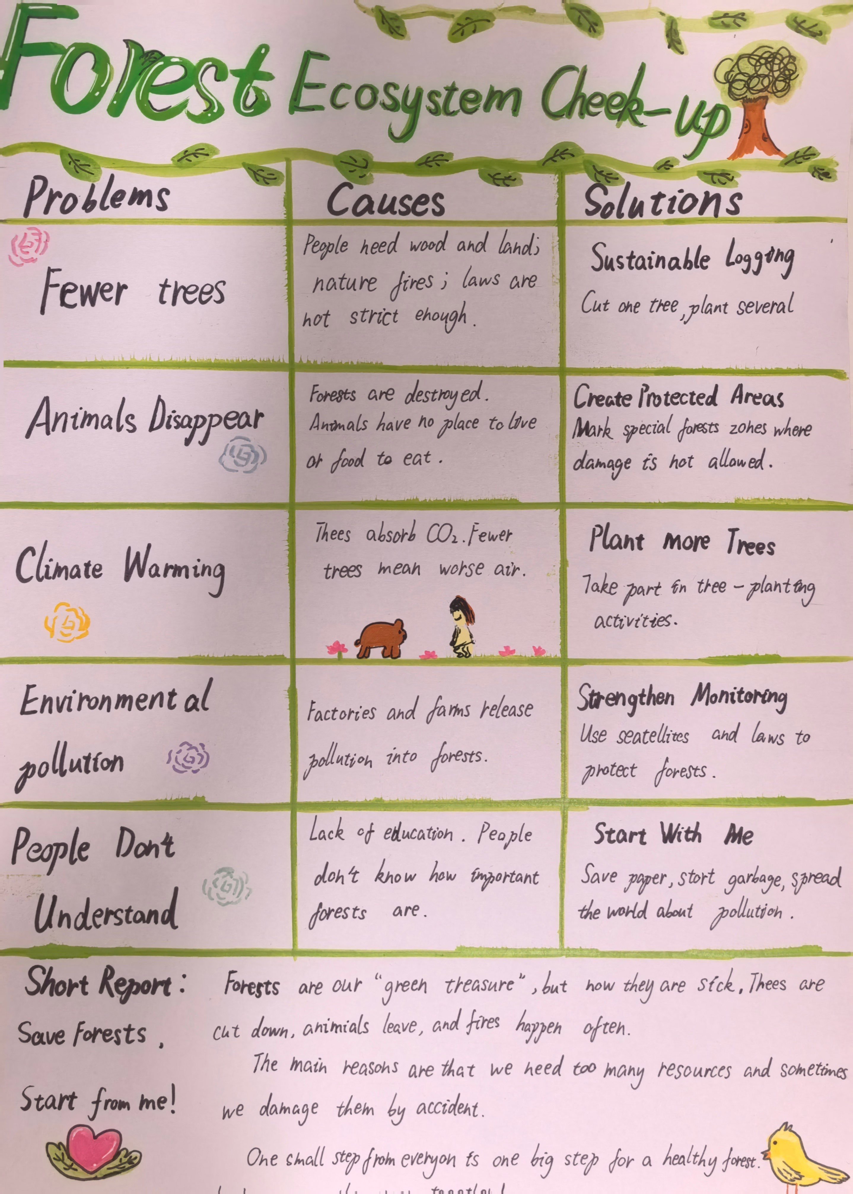 当生态的画卷浮现裂痕,便需以理性为笔,书写疗愈的方案。在“Examine析危·深入诊断”环节中,同学们转型为生态诊疗师,聚焦污染侵蚀、生物多样性衰减等生态困境,深挖问题根源,构思保护良策。一张张图文交织的调查表,铺展开理性与关切;一份份清晰有力的英文报告,沉淀下思考与承诺。英语在此刻成为剖析问题的利器,让生态保护的认知在思辨中扎根;实践在此处化作启迪智慧的阶梯,让“活教育”的理念在探索中生长。