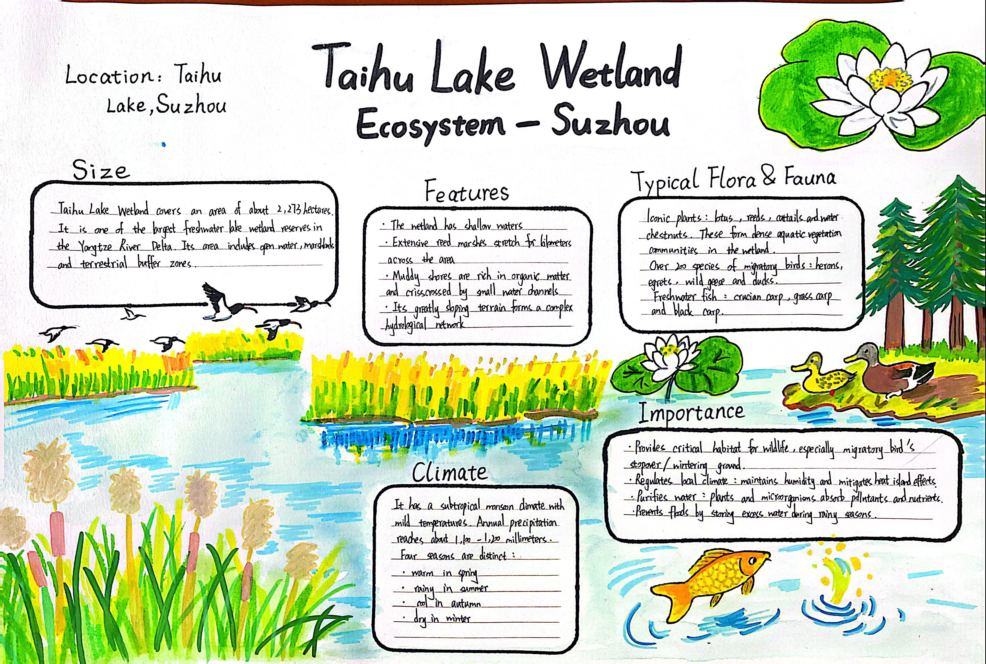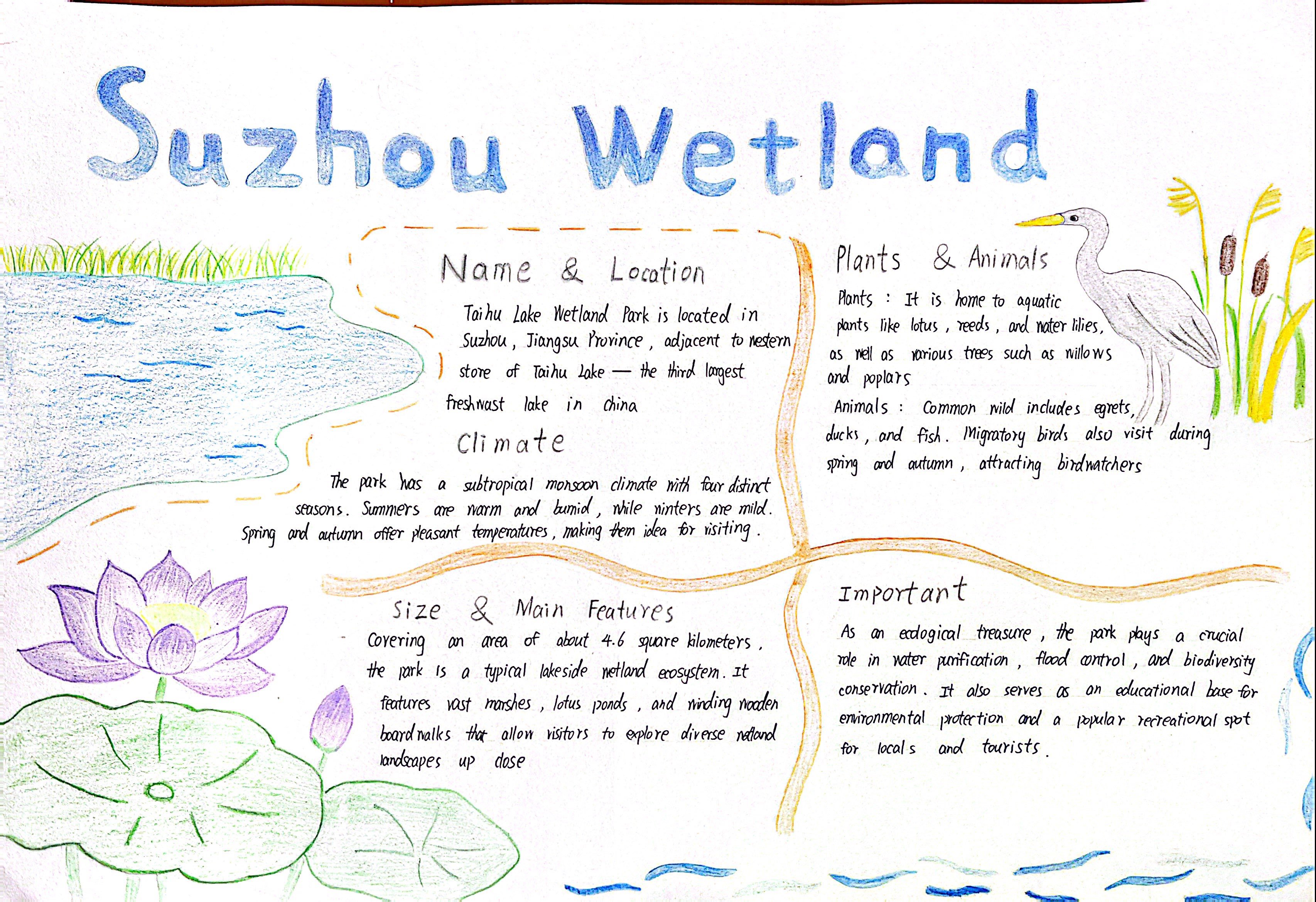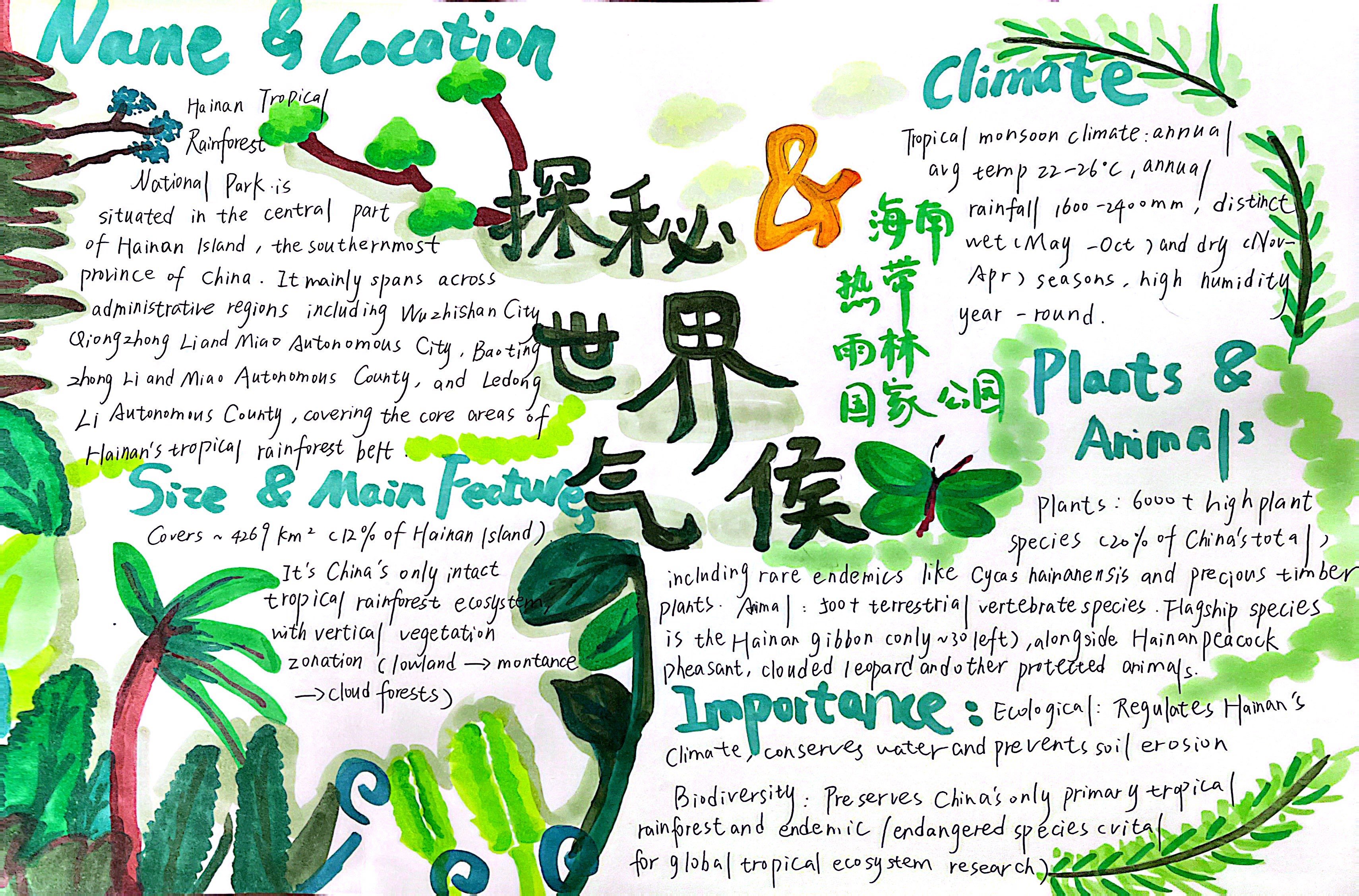 生态的画卷,铺展在太湖湿地的烟波浩渺里,绽放在热带雨林的绿意盎然中,藏在三江源的冰原辽阔间,映在塔克拉玛干的沙海苍茫旁。在“Explore探秘·生态画卷”任务中,同学们化身生态勘探师,循着影像与文字的印记,倾听每一处生态的独白——梳理其方位风貌,解读其气候禀赋,记录其生灵故事。随后,或以手抄报勾勒山河轮廓,或以思维导图梳理生态脉络。一笔一画,是对自然奥秘的执着探寻;一词一句,是对英语能力的扎实淬炼,让生态之美在笔尖流淌,让知识之泉在心田润泽。