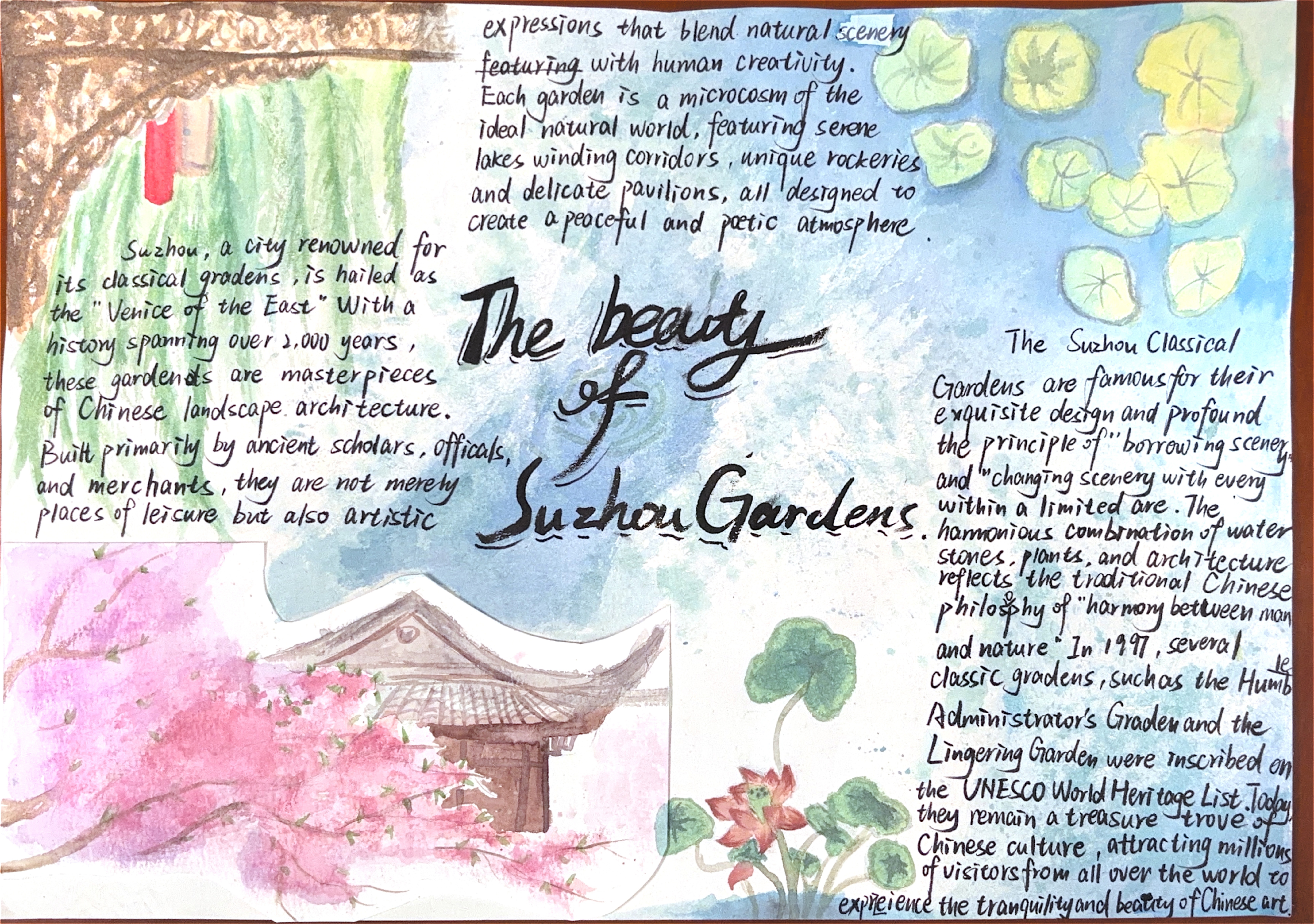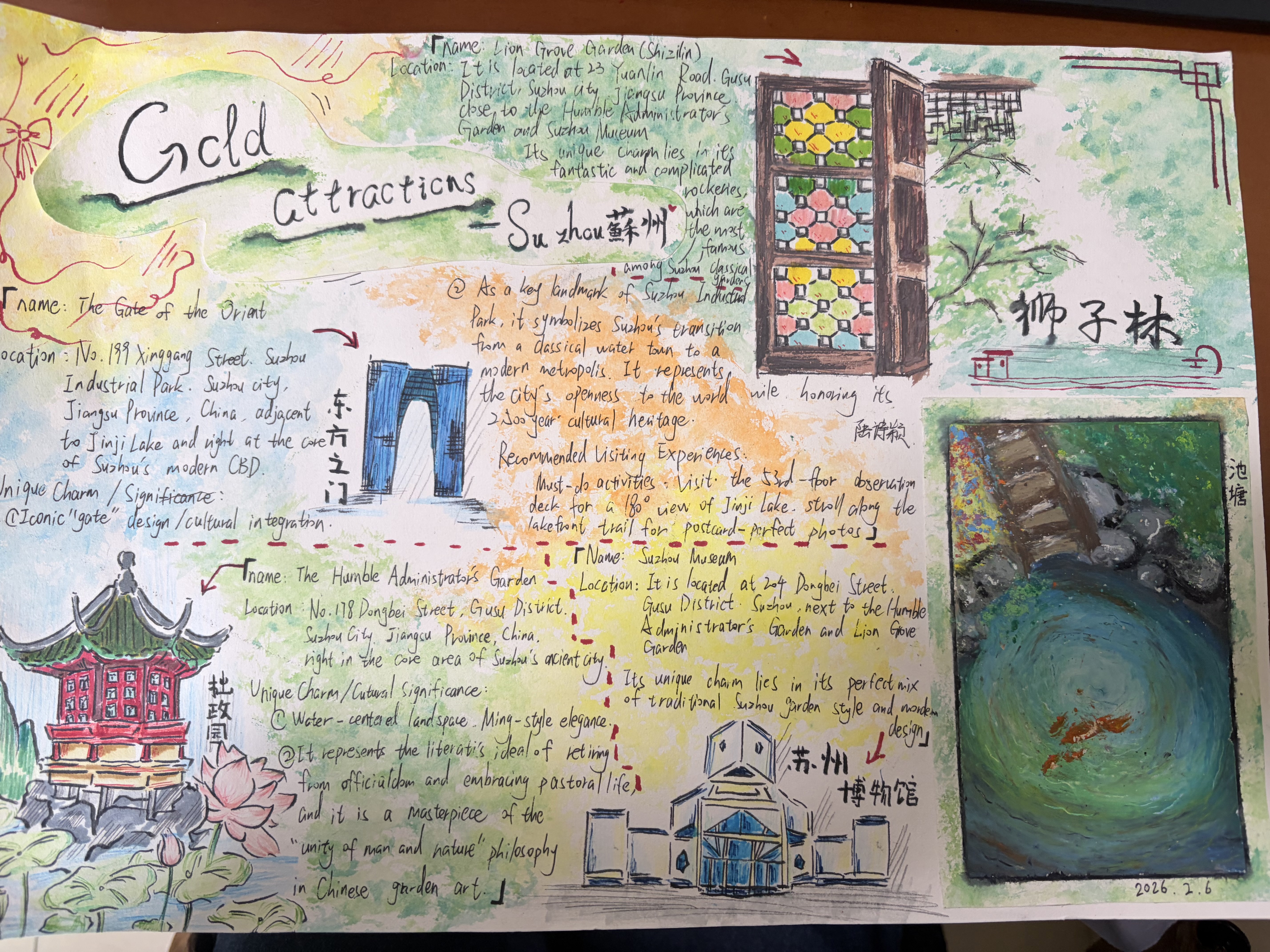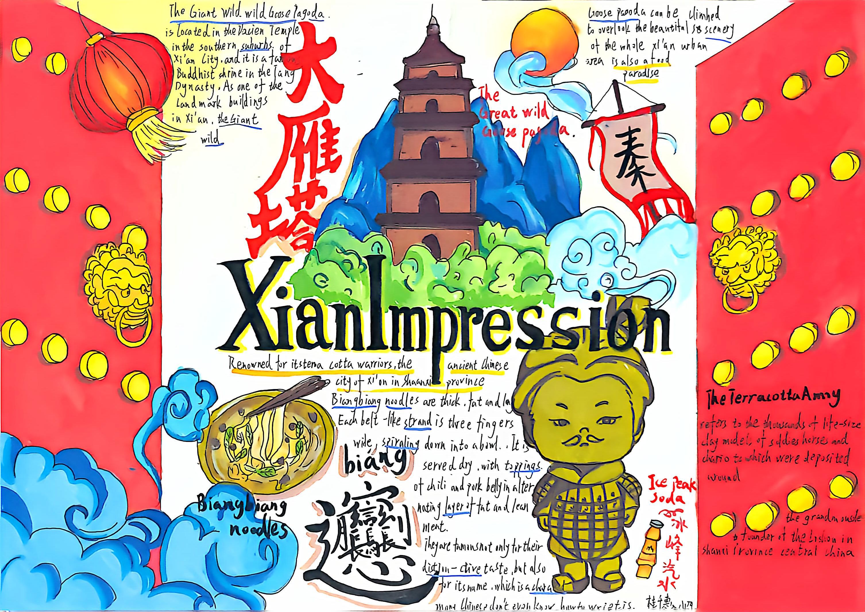碧波学子精选家乡特色景点,在纸上创作英文导览手抄报。手绘美景与英文介绍相映成趣,从地理方位到人文底蕴,从景观特色到游览指引,词句工整、图文并茂。一笔一画锤炼语言素养,一字一句浸润乡土之美,在创作中感受家乡魅力,在书写中提升英语表达。