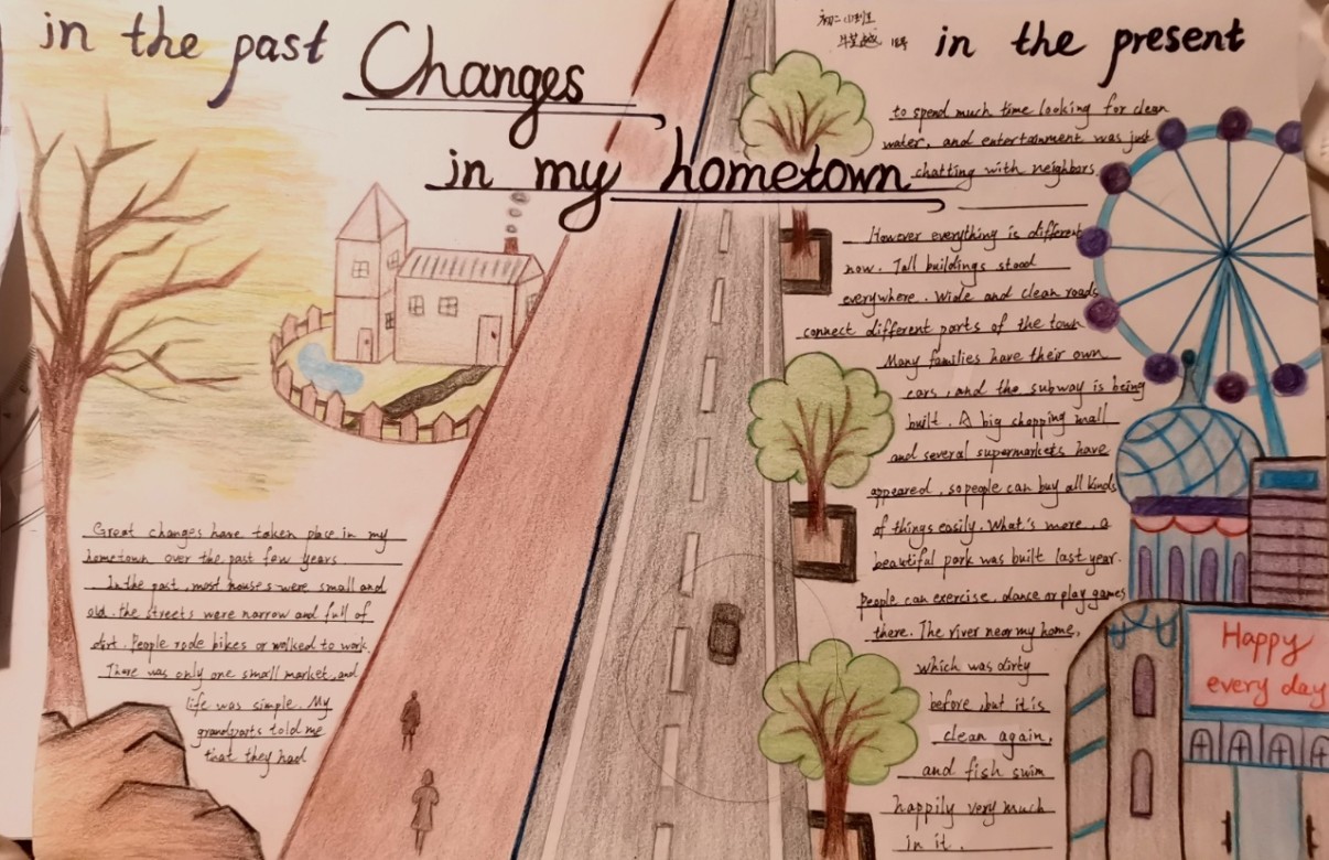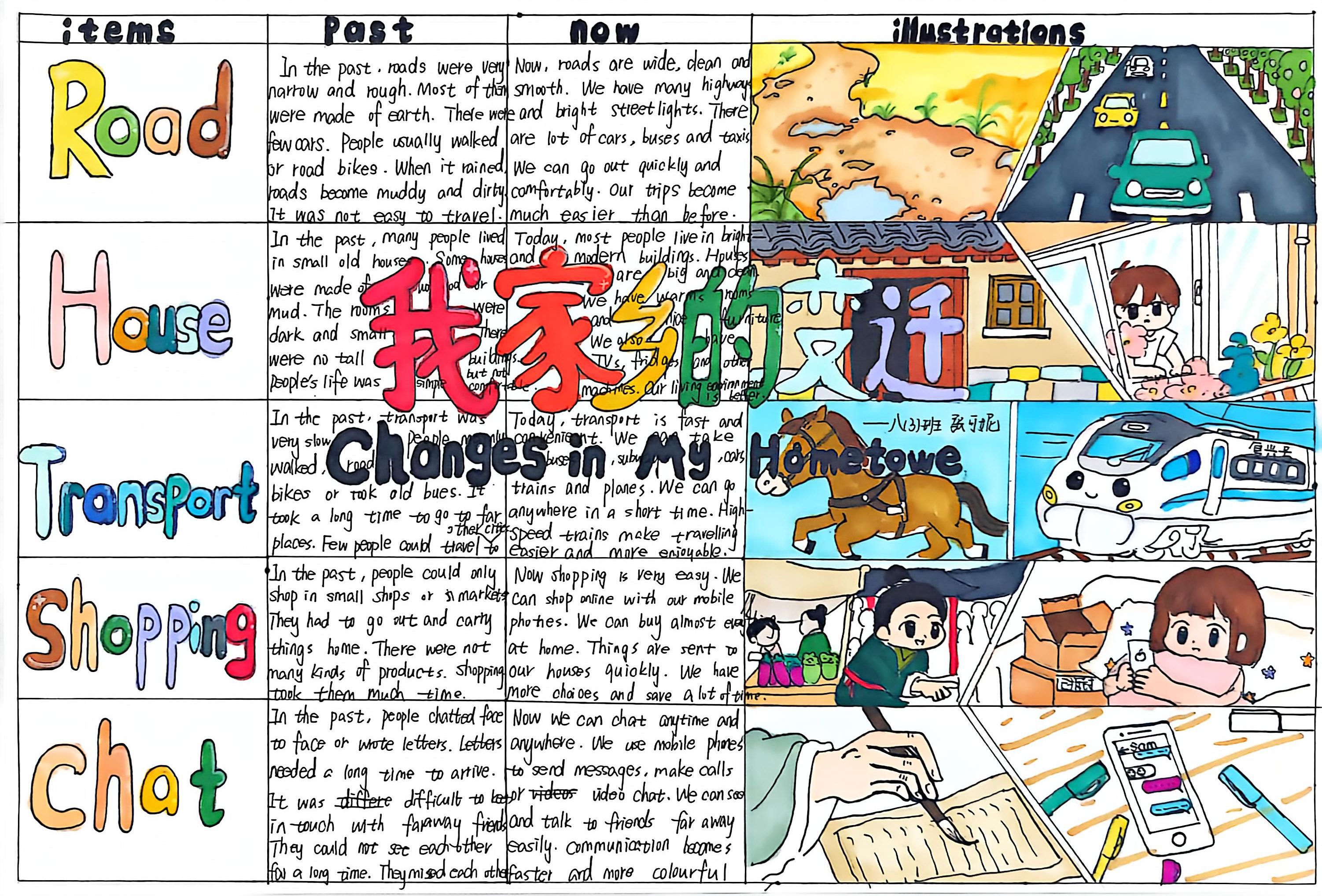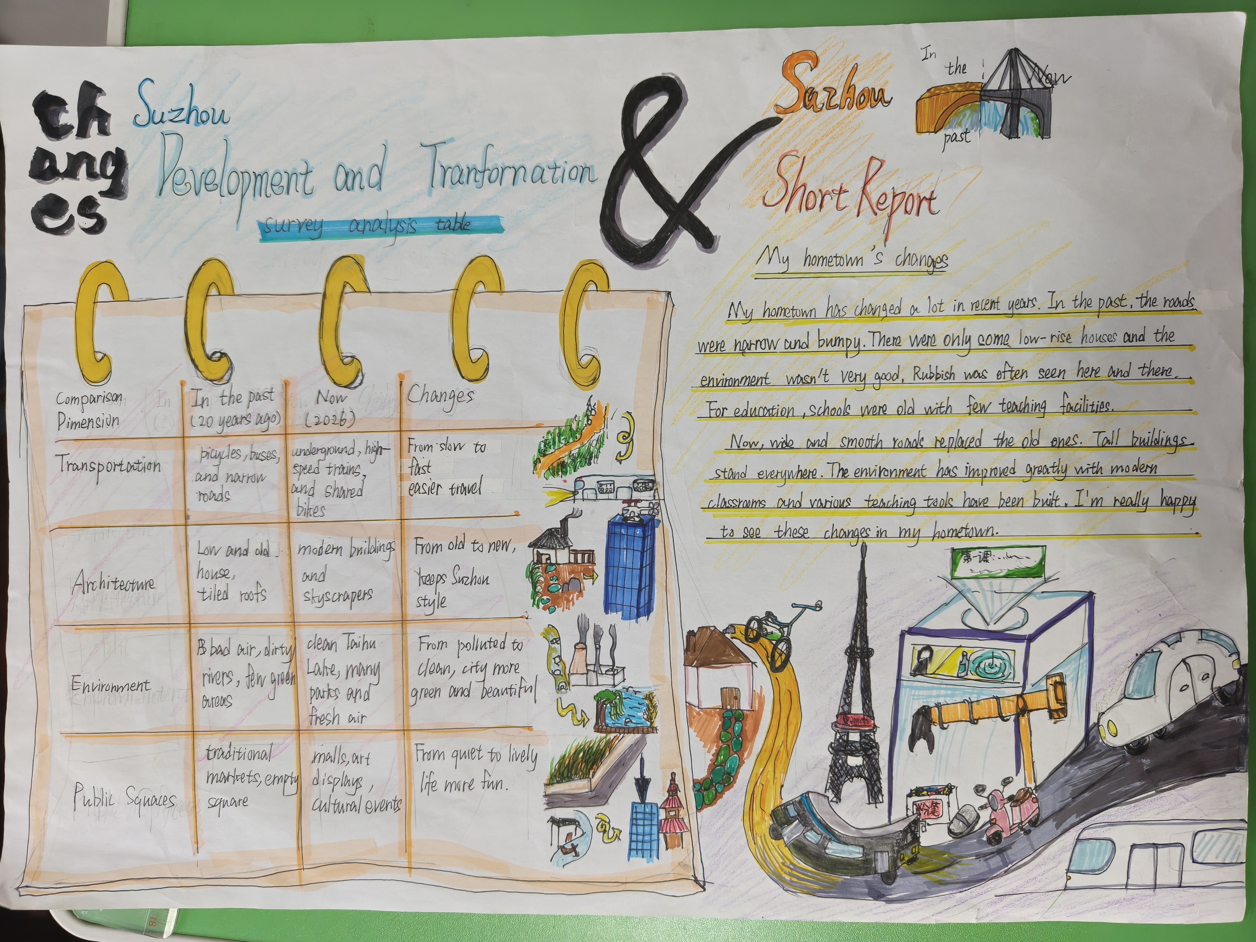 同学们化身时代调查者,通过访谈长辈、查阅史料、对比影像,追溯家乡发展历程。今昔对比调查表直观呈现交通、建筑、环境的时代蝶变,英文调查报告深刻记录思考与感悟。在探究中读懂时代发展,在对比中增强文化自信,让学习真正发生于生活现场。