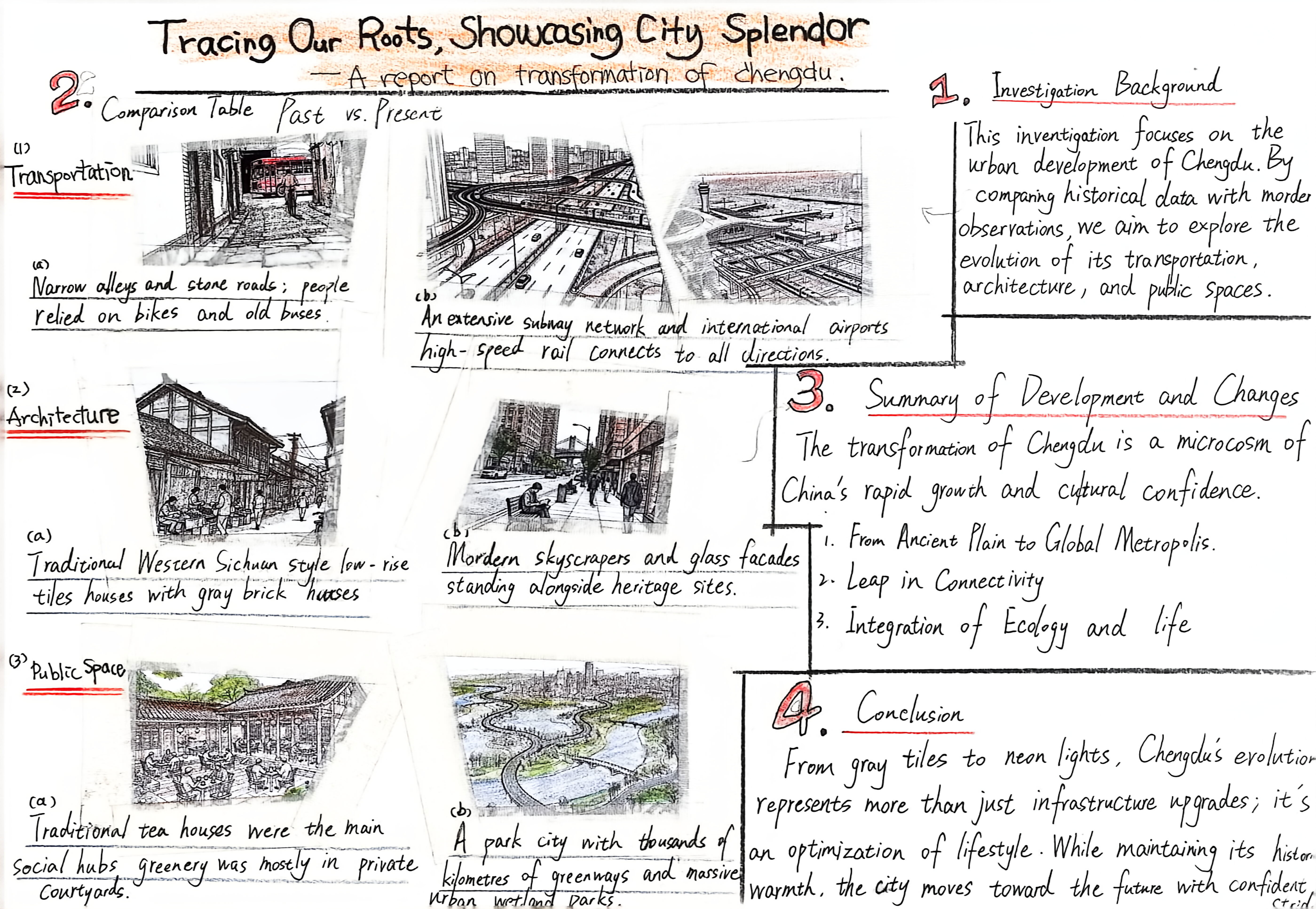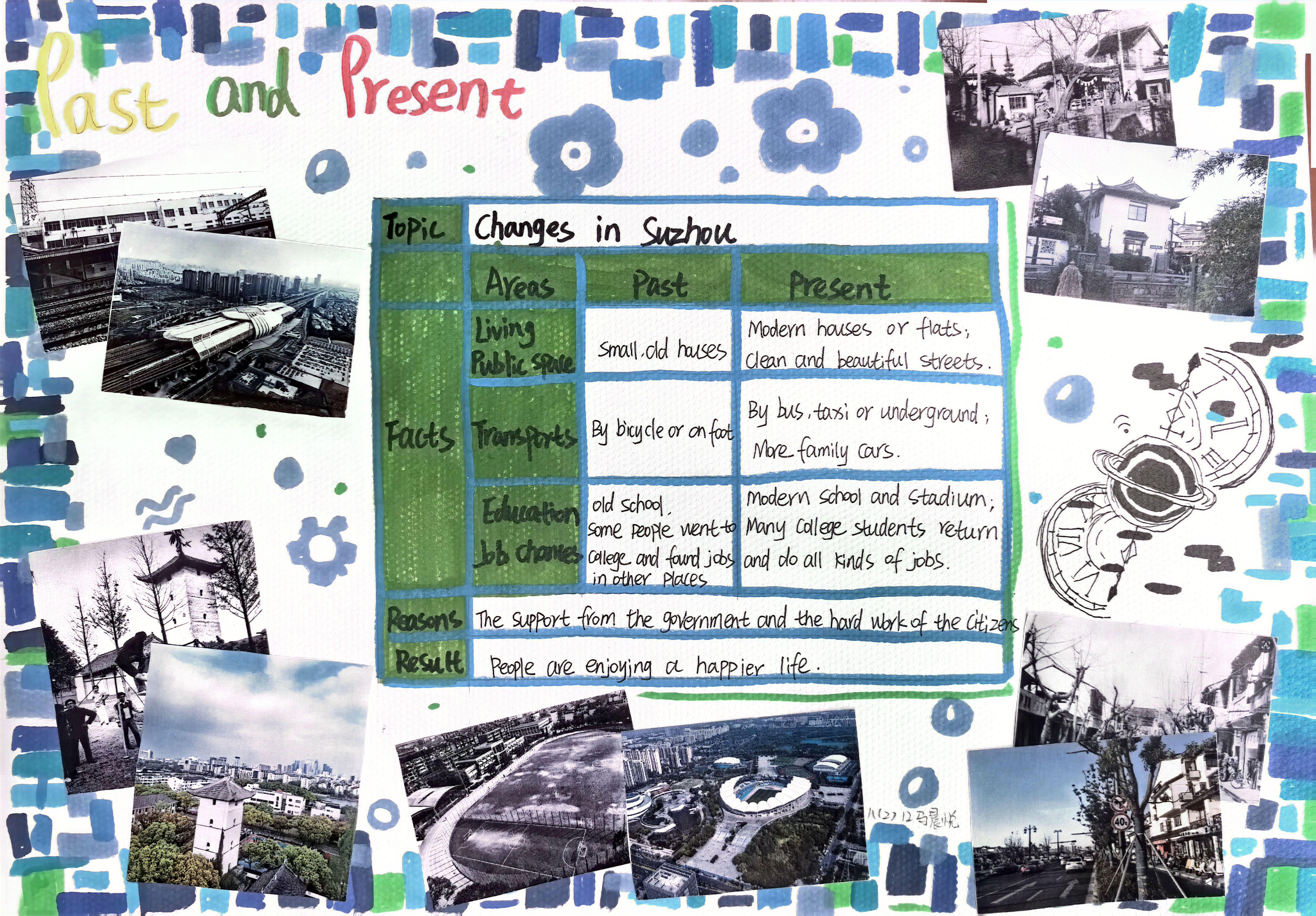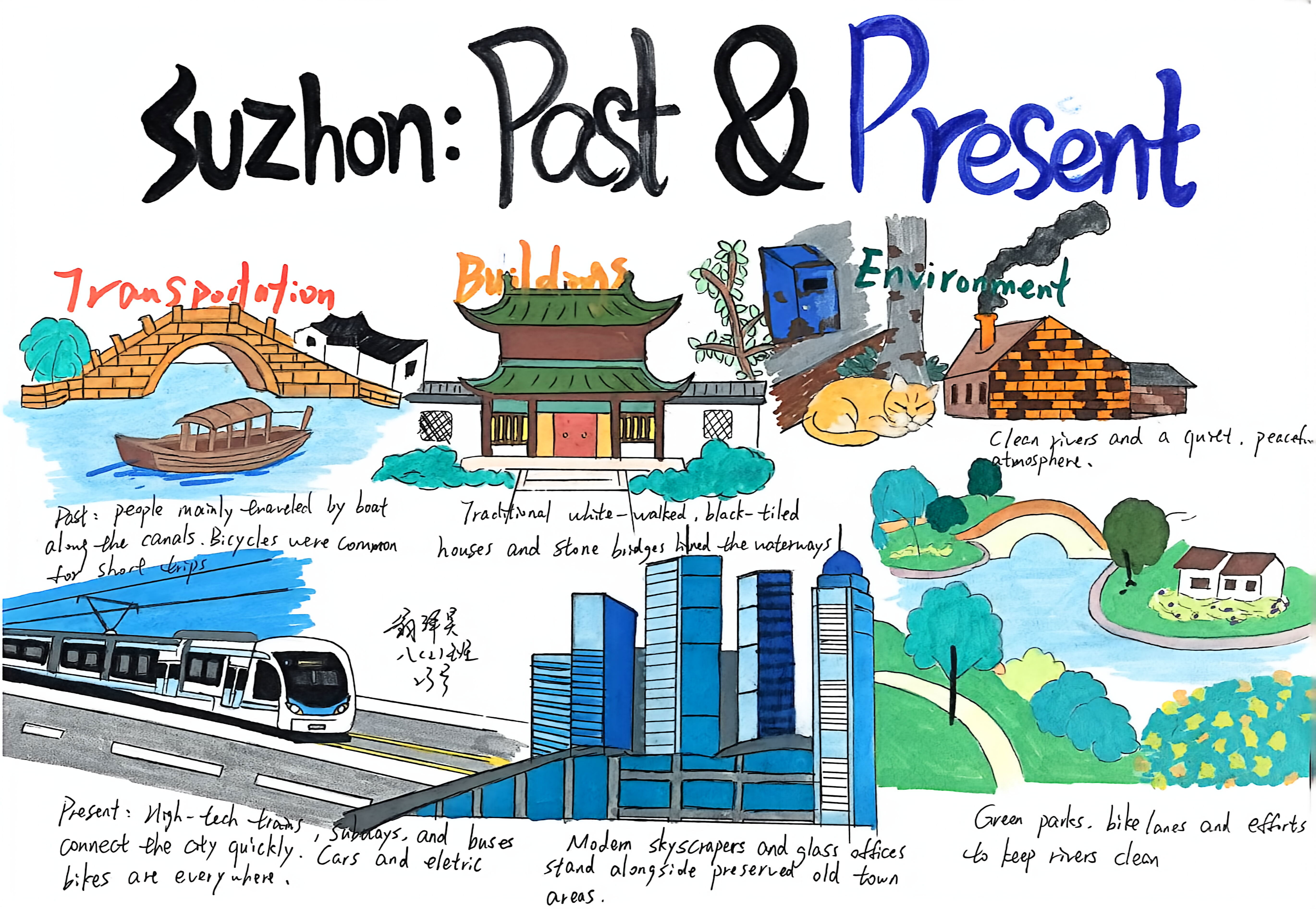 同学们化身时代调查者,通过访谈长辈、查阅史料、对比影像,追溯家乡发展历程。今昔对比调查表直观呈现交通、建筑、环境的时代蝶变,英文调查报告深刻记录思考与感悟。在探究中读懂时代发展,在对比中增强文化自信,让学习真正发生于生活现场。
