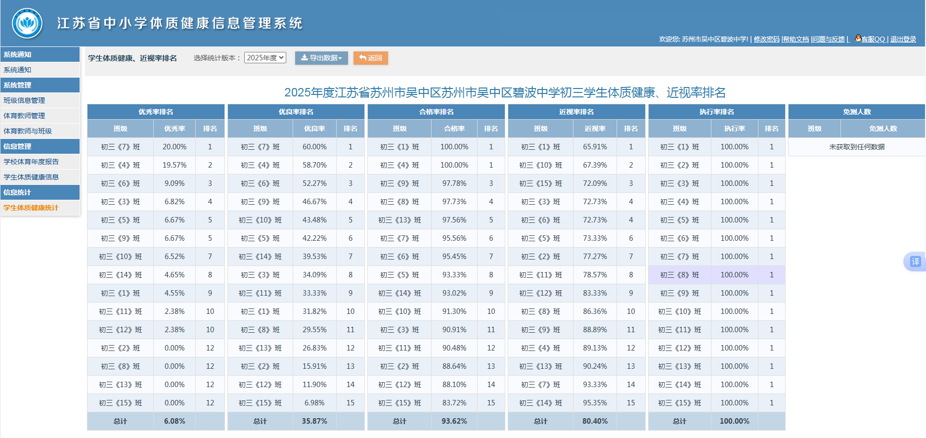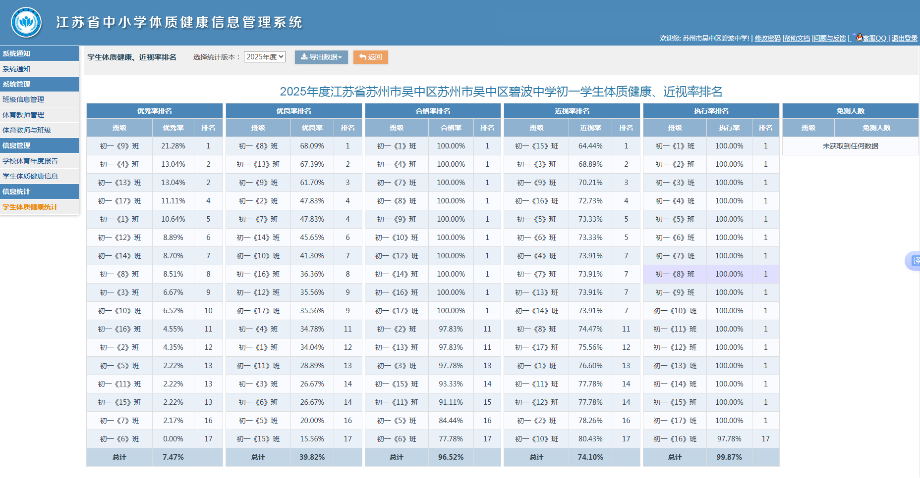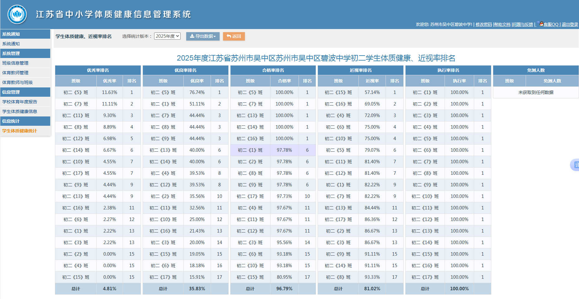 2025年碧波中学学生体质健康、近视率排名公示