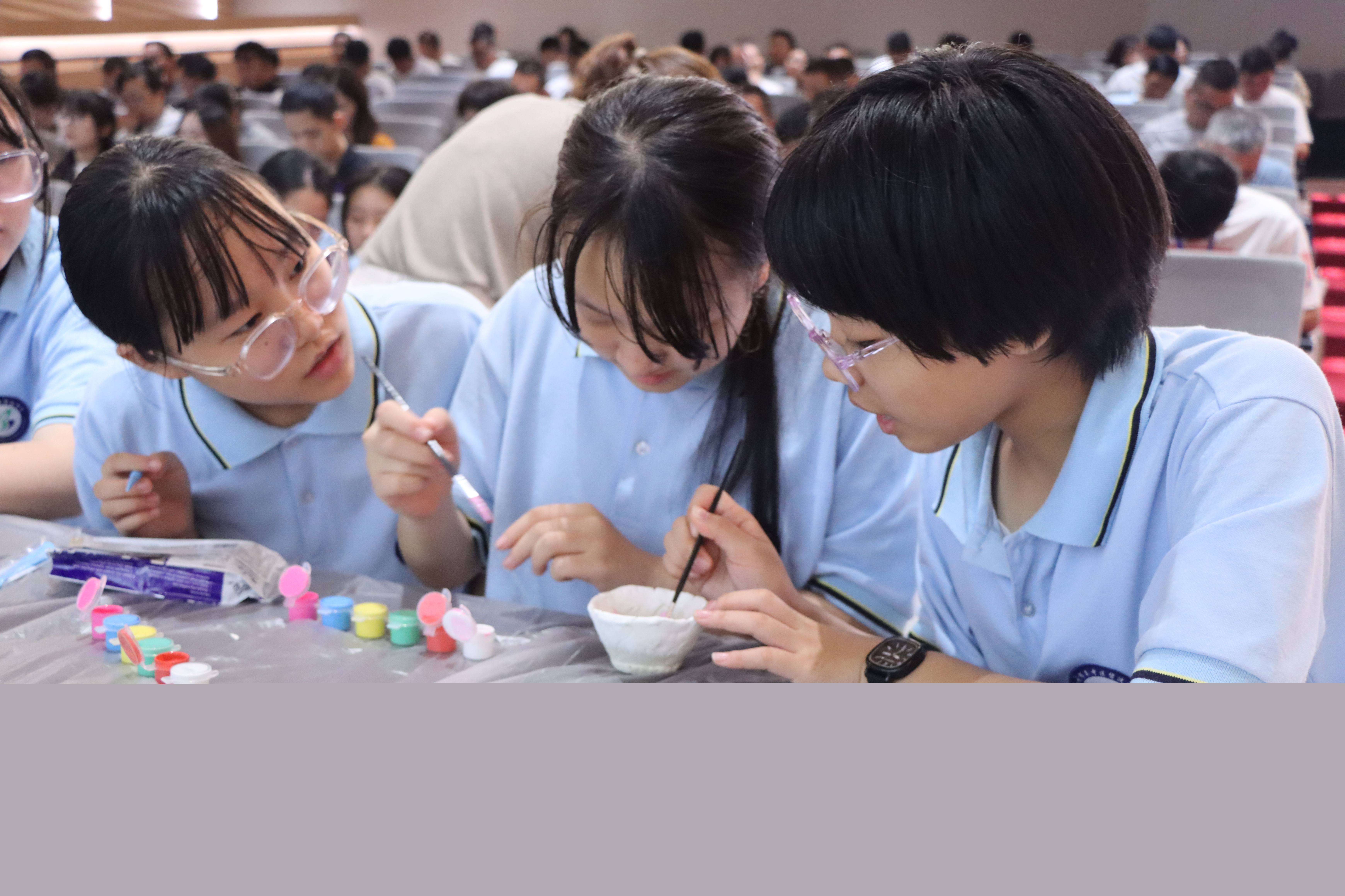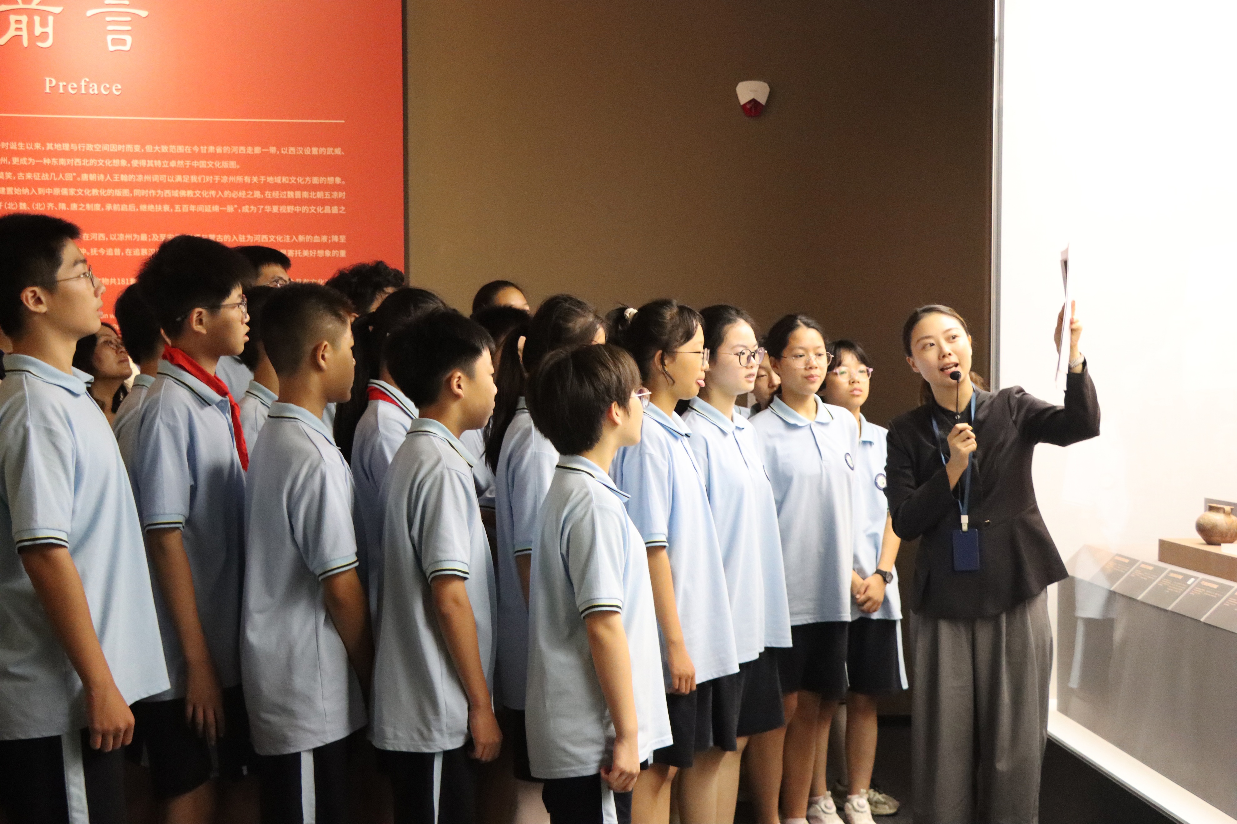 这是一堂特殊的双师课堂思政课,首先碧波中学的方港老师以吴文化博物馆凉州特展为契机,以“和而不同——藏在千年文物里的文化密码”为题给同学们现场授课,吴文化博物馆的吴婕老师带领同学们进入吴博特展“凉州”展的展厅,面对文物进行现场讲解,使抽象的知识更具象化,整堂课将理念学习与实地授课、实展鉴赏、实践创作结合,通过“超时空漫游”“吴地陶韵解码”“展览参观”“陶艺共融”等教学环节,引导学生在吴地文化与凉州文化的比较学习中,触摸中华文化的多元一体,感悟和而不同的中华传统文化的特点,增强了学生的文化认同和文化自信。